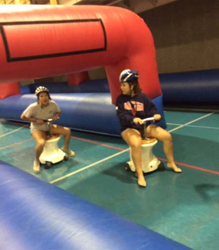 Race against your friends on these electric racers. Sit on these hi-speed replicated toilets to flush away your opponent around the track. Age appropriate for kids and adults Great for ages 10 and up